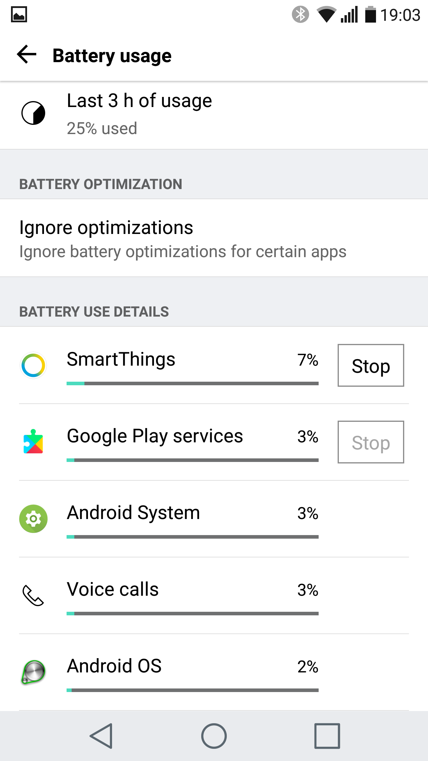 Battery fully charged at 8am this morning, down to 15% by 2pm so charged the phone back to 100%, then after 1hr49min I’m already back down to 76% with the biggest use being the SmartThings app which I haven’t opened in the foreground, so is background use only. Phone estimates I’ve only got 4h20min of battery remaining which is terrible!!