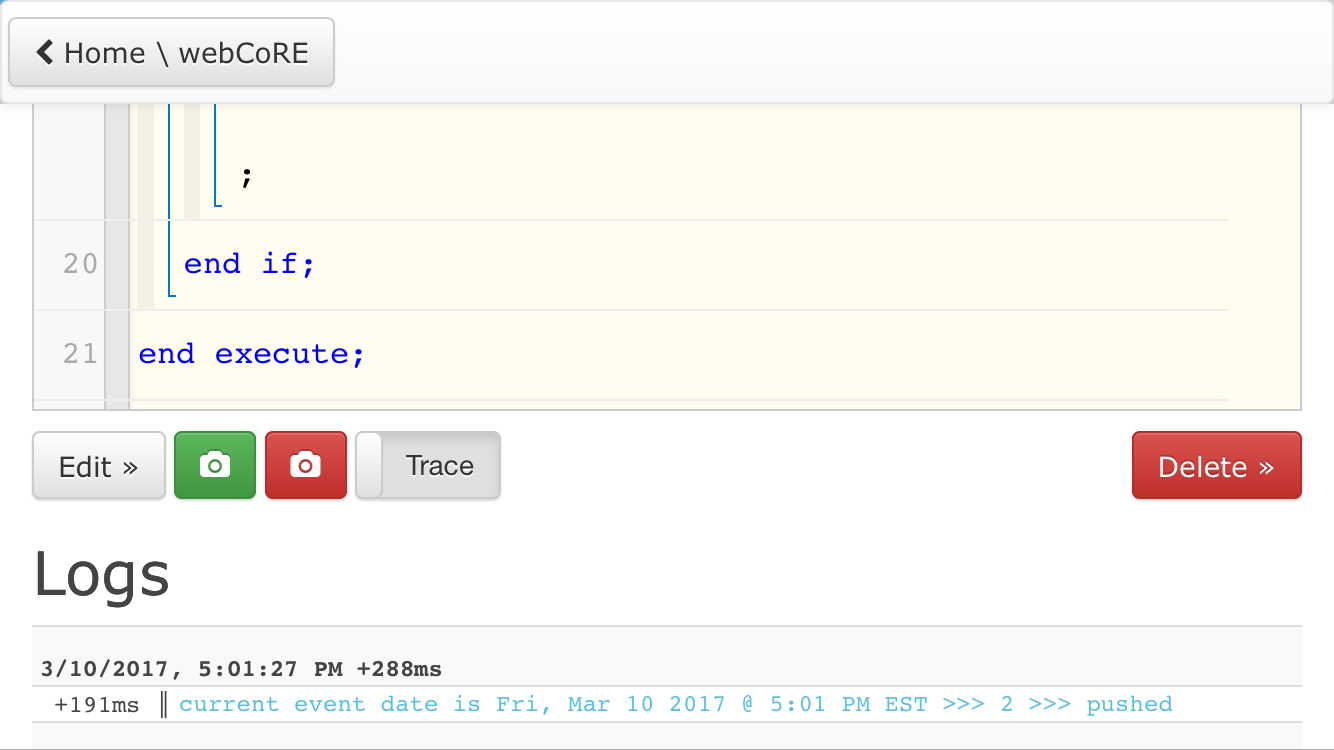 The ālogā virtual command logs even if logging is disabled in CoRE. The logs also show in the IDEās Live Logging.