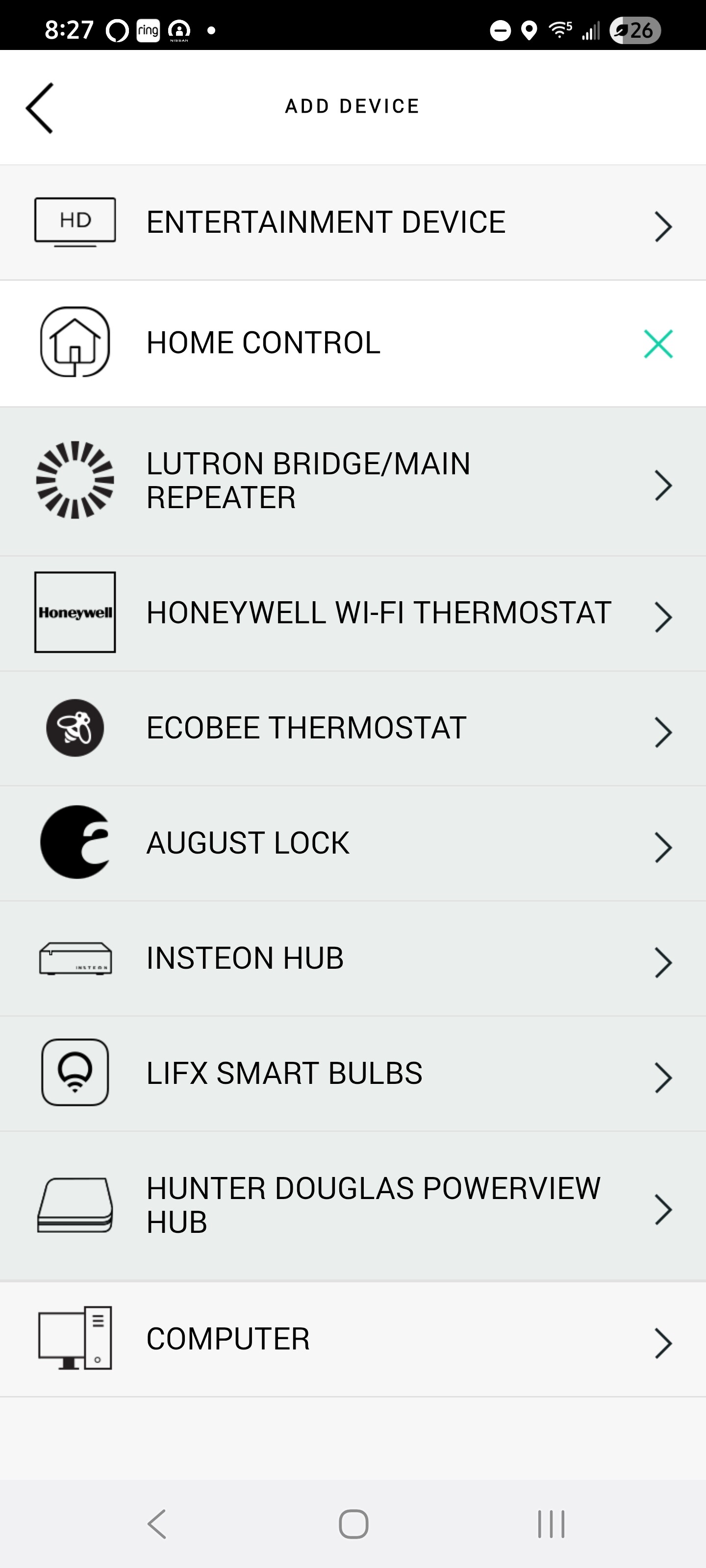However, I noticed you have less options under Home Control than I do regardless. Maybe you need to update your Harmony app? Or maybe your Harmony device has more limitations than mine? IIRC there were device limits depending on the Harmony product.
