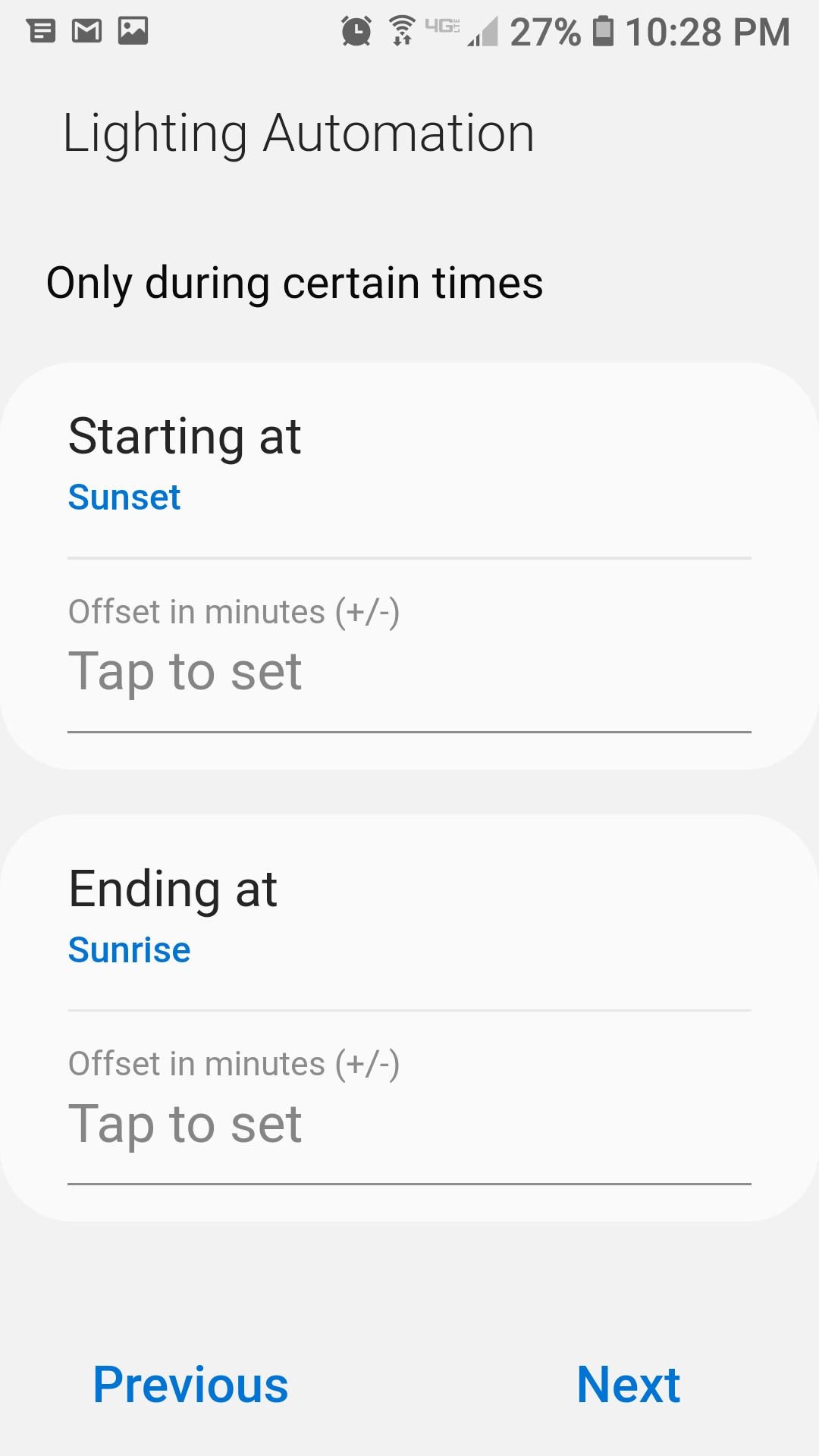 Smart lighting in the new V3 app (smart lighting is the same in both apps) can do that.