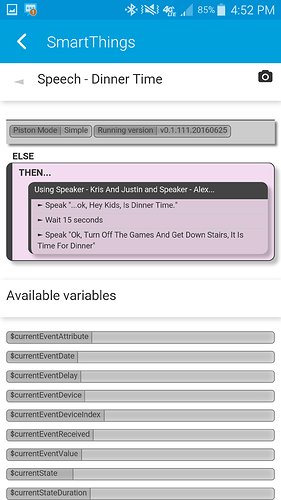 In the Core smartapp change the piston from what you have to a simple piston that has a blank If section and only has the Then section configured… like this (your AskAlexa app is fine)…
