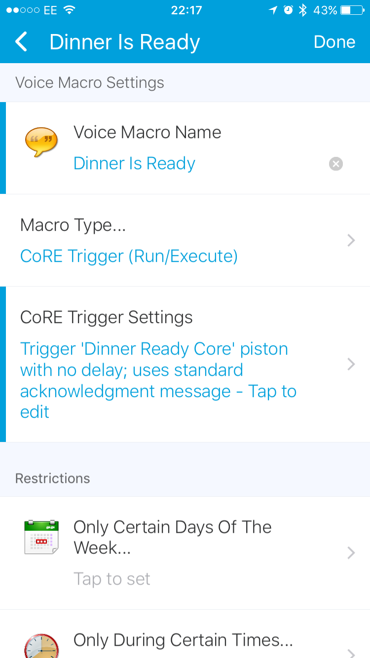I stumbled on a weird workaround to my issue. I was having the problem I mentioned when I went Marketplace -> SmartApps -> My Apps -> Ask Alexa. But if instead of that, I tapped the top right menu and went Menu -> SmartApps -> Ask Alexa, it works fine and goes to the main Ask Alexa page instead of direct to a macro. I have no idea why it works one way and not the other. Regardless, this is a great app that finally makes Alexa and SmartThings do all the functions I’ve wanted it to do. Thanks for all the work and the responsiveness on the forum!