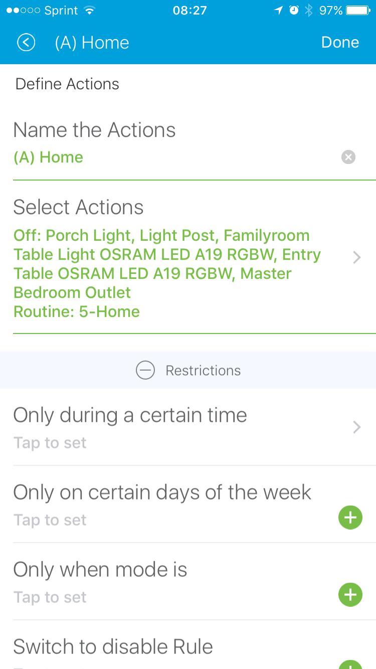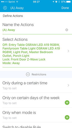 So you would need to create a rule in RM for goodbye & set it up exactly like your routine. Then create a rule for stay home. Then create a rule for the one person leaving the house. Then you would set up the rule to evaluate both actions. I will see if I can create a screen shot of what you are looking for. However it might be a little bit since I’m at work & really not suppose to be on my pad lol.