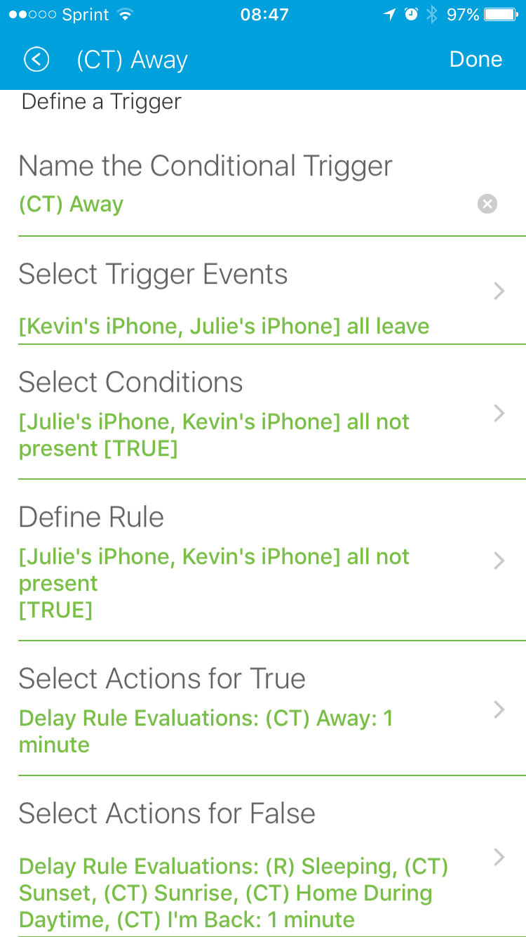 It’s easier if you think of your house in 6 categories (away, stay, sunrise, sunset, sleeping, & I’m back) & then configure them around each other using the opposite action or actions to counter the true action.