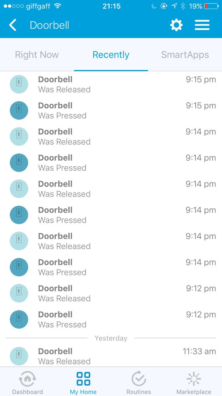 This all appears to be working okay and I can see from the SmartThings app and api logs that the events are appearing correctly:
