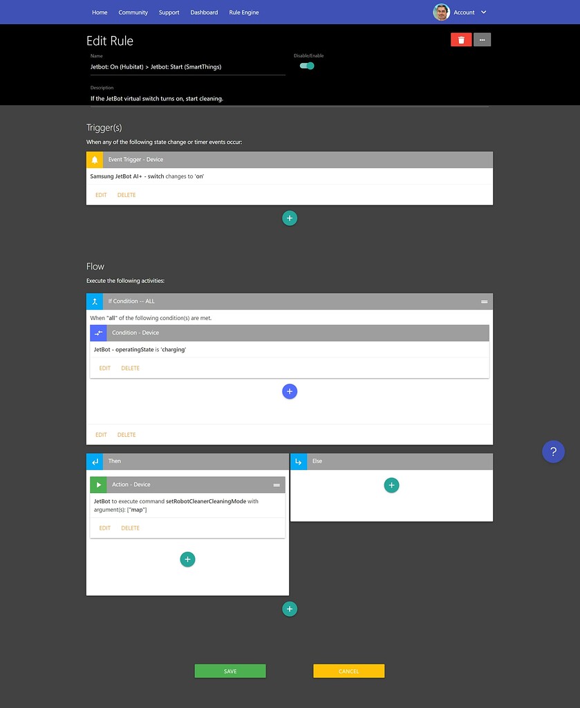 I’m trying to connect my new JetBot robot vacuum to a virtual switch on Hubitat. I’m trying to connect it via IFTTT; however, the only part of it that is working is Hubitat. The SmartThings and Samsung Robot Vacuum services on IFTTT don’t seem to work.
