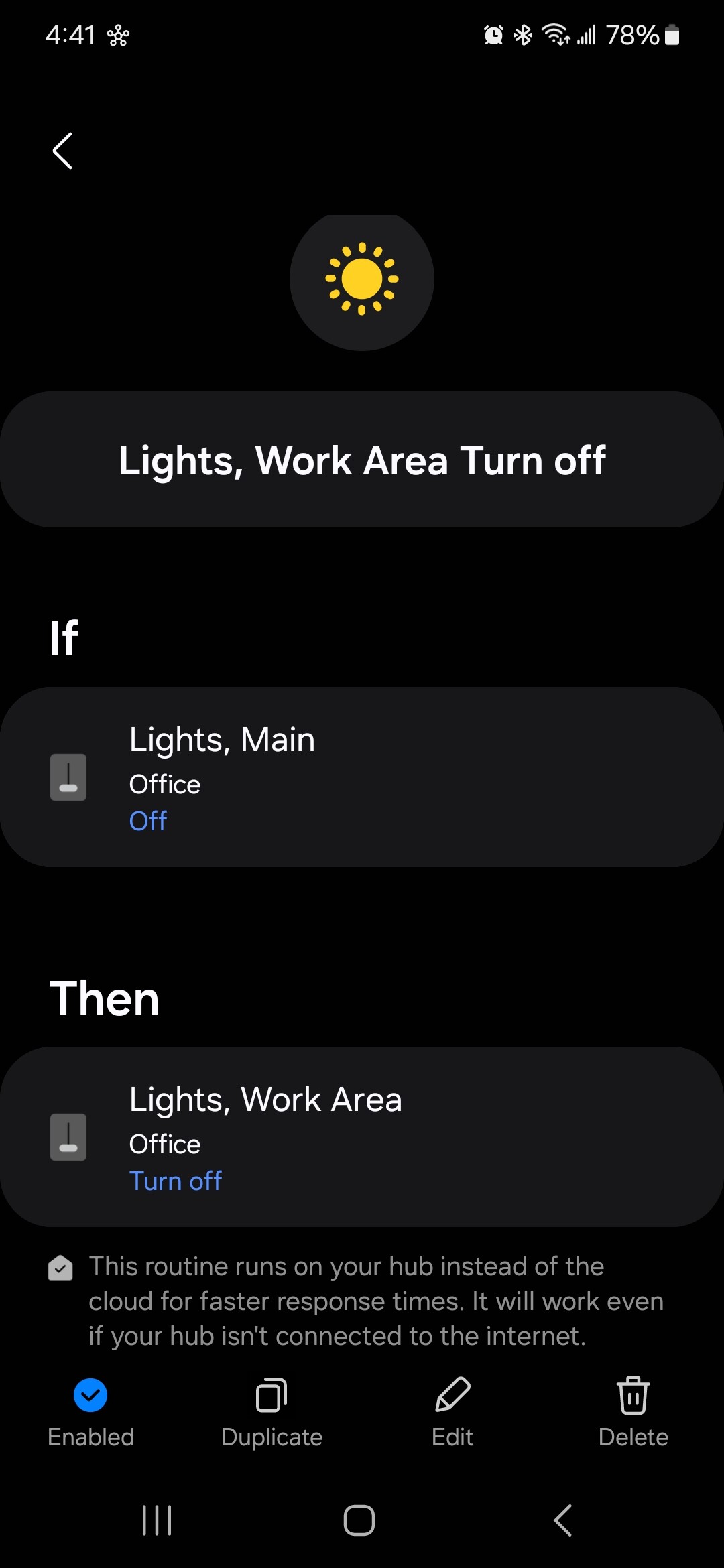My understanding is that your Routine should attempt to turn off the Work Area Lights whenever it receives an event saying that the Main Office Lights are off. It doesn’t care what the previous event from those lights was, only that this one is off.