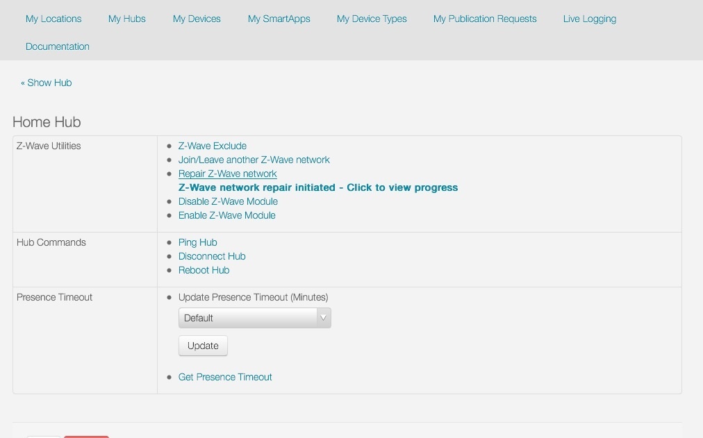 - I clicked “Repair Z-Wave network” under the ST hub’s utilities link on the ide.smartthings.com page,