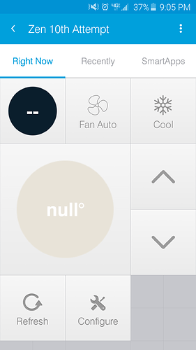 I created two new device handlers from code posted by a contributor via GitHub; both handlers allowed connection to the device but once again, no temp readings and the buttons do not actually do anything. For now my Zens are pretty looking manual thermostats.